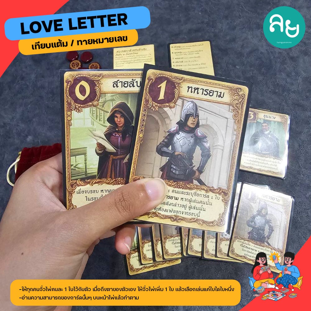 เกมจดหมายรัก ที่เข้าใจง่าย เล่นสนุก และจบไว โดยเริ่มเกม ให้ทุกคนจั่วไพ่คนละ 1 ใบไว้กับตัว หลังจากนั้นให้วนเล่นทีละคน เมื่อถึงตาของตัวเอง ให้จั่วไพ่เพิ่ม 1 ใบ แล้วเลือกเล่นแค่ใบใดใบหนึ่ง โดยจะเล่นจากหน้าไพ่ เช่น การทายเลขในมือของเพื่อนอีกคนหนึ่ง ถ้าหากทายถูก เพื่อนคนนั้นก็จะแพ้ทันที หรือไพ่ที่สามารถขอดูไพ่เพื่อนคนอื่นๆได้ ชนะ 1 ตาได้โทเคน 1 เม็ด สะสมครบ 3 เม็ดจะกลายเป็นผู้ชนะ